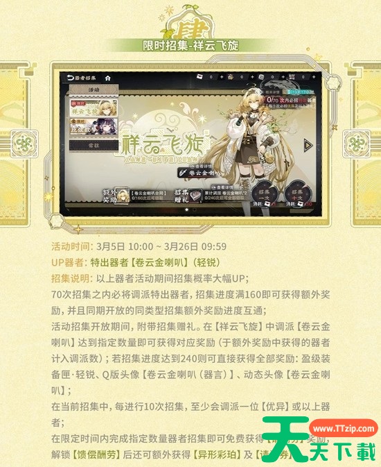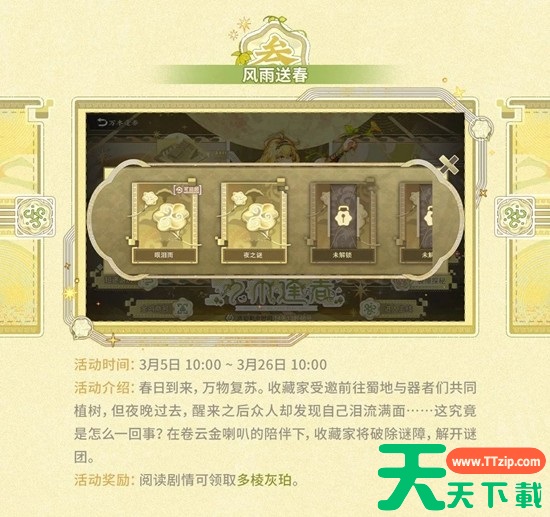 版本开启后,收藏家可前往体验第七章主线剧情「万木逢春」及卷云金喇叭个人剧情「风雨送春」。