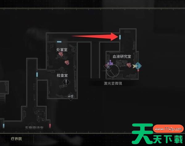 来到血液研究室,桌上拿到【采血器】,采集各处的感染血液可以用来合成物品。感染血液此时在地图上已经全都自动标出来了,放心暂时不捡也不会消失,随着探索进行慢慢的你就会把它们用完了。