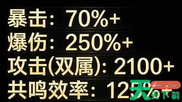 副词条优先级:暴击率≈暴击伤害>百分比攻击>普攻伤害加成>共鸣技能加成。需要注意副词条适当堆叠共鸣效率(约125%)以保证循环。