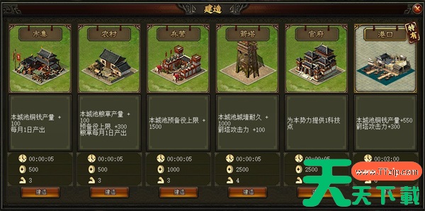 游戏中可建造共有5种普通建筑以及9种特殊建筑,丰富的建筑种类涵盖了经济、军事、科技三大方面。