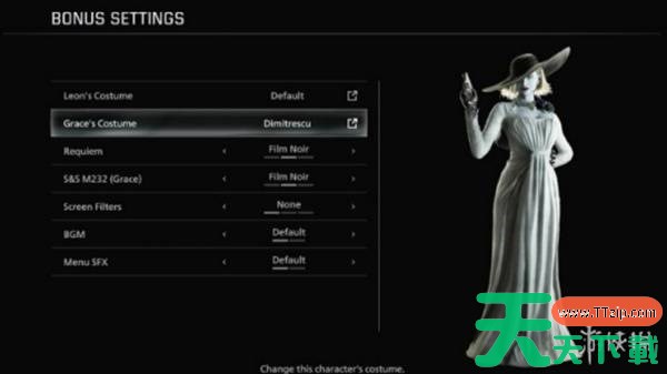 奖励设置菜单显示莱昂和格蕾丝所有已解锁、可装备的物品。它还会预览装备后物品的外观。