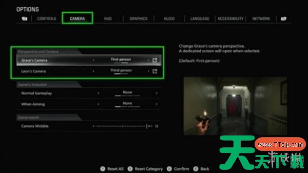 在视角设置中,玩家可以分别调整里昂和格蕾丝的视角模式。