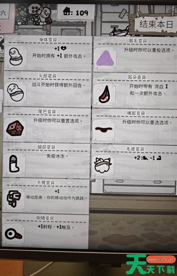 3、宅家里变异上限10条,如果有9正面1负面的情况,丢变异房会把1负面转换为同部位的正面,也就是顶掉了(此法可以锁定部位进行变异)。