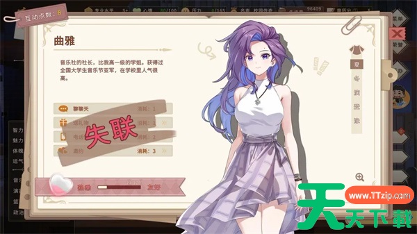 在我的时光大学日记游戏中玩家们可以与不同的女角色达成恋人关系,其中部分玩家不知道曲雅恋人关系应该如何解锁,下面就为大家带来我的时光大学日记中曲雅恋人关系的解锁条件,有需要的玩家可以参考。