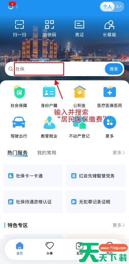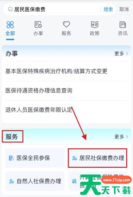 第二步:登录后,首页搜索“居民医保缴费”,点击“服务-居民社保缴费办理”
