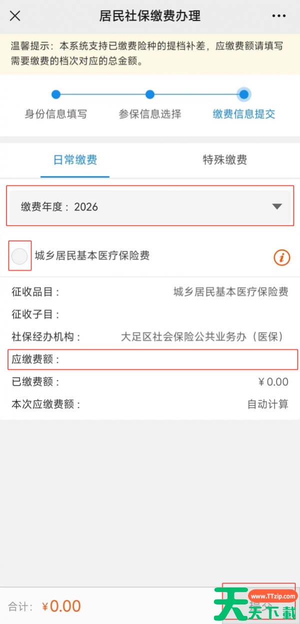第五步:缴费信息提交。(选择2026年,根据自己需求选择缴费档次)