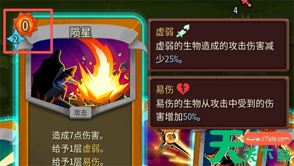 【陨星】:造成7(11)点伤害,给予1层虚弱,1层易伤
