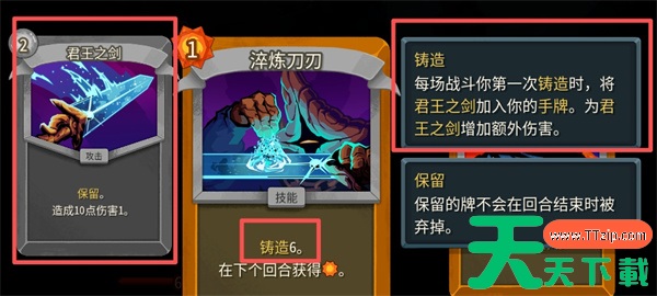 【铸造】:每场战斗你第一次铸造时,将【君王之剑】(使用时消耗2点能量)加入你的手牌,为【君王之剑】增加额外伤害。