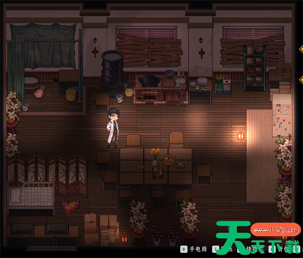 罐子右边是灶台,做饭在这边,你的饱食度来源,没点出来之前就只能靠箱子里面摸出来的压缩饼干或是之前买的饭菜过日子。