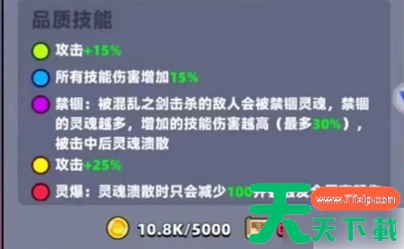 3.紫色:被混乱之剑击杀的敌人会被禁锢灵魂,禁锢的灵魂越多越多,增加的技能伤害越高,最高增伤百分之三十,被击中后灵魂消散。