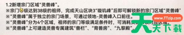 为我们带来一个新的区域:灵兽峰,里面可以修建或者修复兽栏(驯灵苑),育兽房和九黎殿(暂未开启)