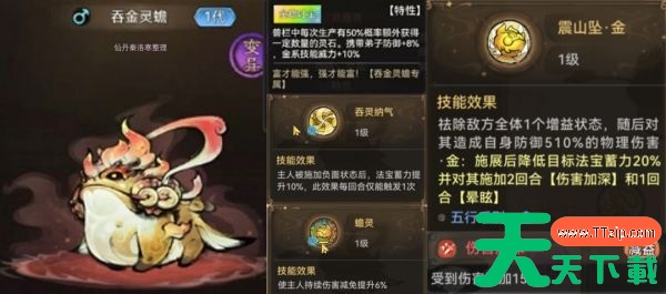 c. 词条:携带弟子防御+8%,金系技能威力+10%。十分适合金系至尊宝,石头人也可以吃到一半的词条,对于辅助来说也能吃一半的词条增加坦度。