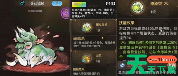 技能挺猛。而且因为宠物技能不限制弟子灵根,所以所有弟子都能带,相当于所有灵根都有了复活技能。