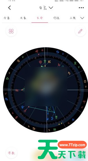 2、进入星盘页面后,可以看到自己的本命星盘,此时星盘上是没有婚神星的,点击右下角的齿轮【设置】;