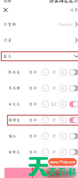 3、在【虚点】设置中找到【婚神星】,将右侧的滑块打开,点击【确定】,在星盘上显示婚神星位置;