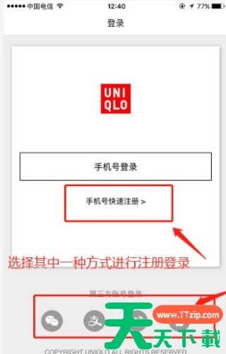 第四步、进入“登录/注册”页面,可以选择“微信、支付宝、微博和QQ”直接登录,也可以选择使用手机号注册,本次选择手机号注册;