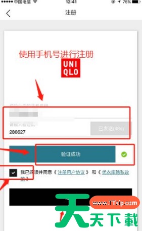 第五步、在注册页面,输入手机号,获取验证码并输入,用户协议以及隐私协议打勾,然后点击“注册”,即可成功开通优衣库,如图2。