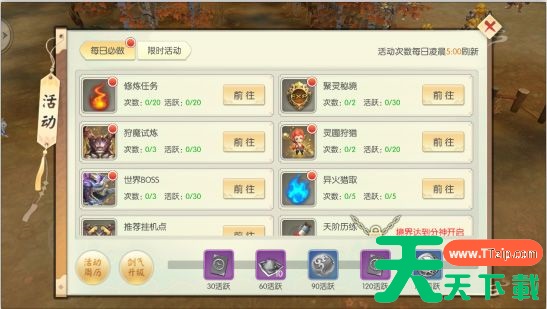 技巧2.日常任务:随着等级提升会解锁更多玩法、副本,通过点击“日常”按钮,即可快捷参与到各项日常活动中,获得大量金币、经验、道具、装备等奖励,组队刷怪还有经验加成,所以叫上你的小伙伴,来打怪升级吧!,其中每天2次的聚灵秘境经验非常丰富,是现版本最好的升级渠道没有之一,所以千万不要错过。能有经验加成的药水就不要吝啬,狠狠的砸上去吧。另外,20环的修炼任务也提供有大量的经验与金币奖励。