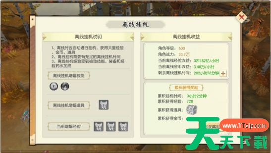 技巧4.离线挂机:你的一分一秒都很关键,不要以为下线了就无法冲级,御剑修仙里有大量的离线挂机卡,可以通过提升活跃度、元宝购买等各种渠道或得,攒尽可能多的卡,找个经验高的图,带上药水,开启离线挂机。只要足够有心,服务器大佬不是梦想!
