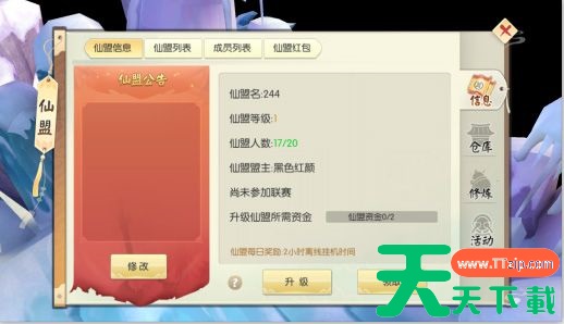 仙盟内成员可通过帮派任务、日常任务、帮派活动来增加仙盟资金,而仙盟资金可用于仙盟升级,仙盟升级后可增加仙盟人数上限,另外加入仙盟即可获得每日奖励哦~
