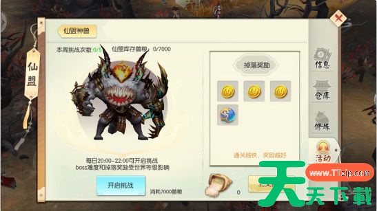仙盟内成员可通过帮派任务获得兽粮,上交兽粮后盟主和副盟主可开启仙盟boss挑战