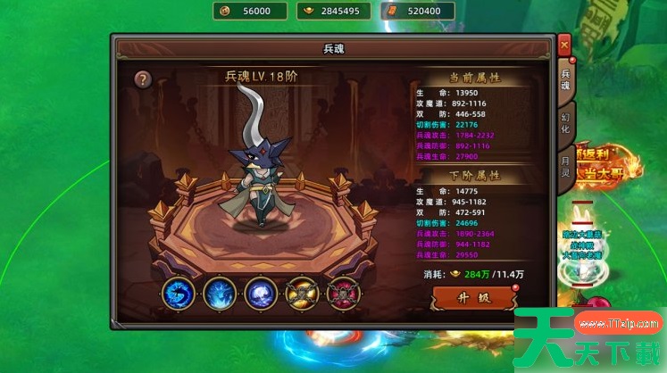 兵魂提供的战力增益非常强大,但获取非常简单,开局直接就送兵魂,打怪无压力,兵魂可以进行单独养成,升级兵魂可以获得大量属性,到达一定等级之后还可以解锁兵魂技能,碾压怪物;另外,完成兵魂试炼可以获得大量兵魂时装,外观随便换!