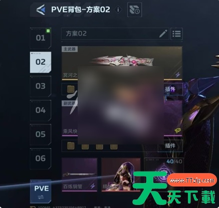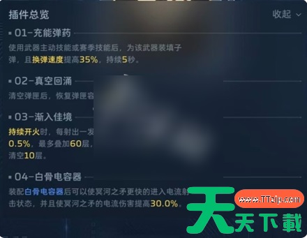 3、这里2号插件和纯白是有区别的,冥河之矛得2号要带真空回涌,不要无限续子弹,要等到打空子弹,触发换单动作,并且能量已经涨了之后,直接用乘风技能打断换弹动作,继续输出,这样的话,基本上21秒就能充能完成,21秒一个大,另外就是4号要带专插。