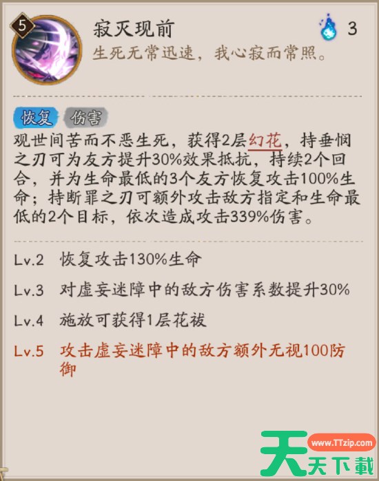 观世间苦而不恶生死,获得2层幻花,持垂悯之刃可为友方提升30%效果抵抗,持续2个回合,并为生命最低的3个友方恢复攻击100%生命;持断罪之刃可额外攻击敌方指定和生命最低的2个目标,依次造成攻击339%伤害。