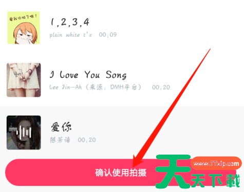 点击了之后,就进入了选择音乐的界面,这里的音乐有几个类型,但是不知道自定义音乐。所以选择自己想要的音乐,点击了之后可以试听,试听之后满意的话就可以点击红色字体【确定使用拍摄】