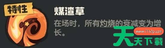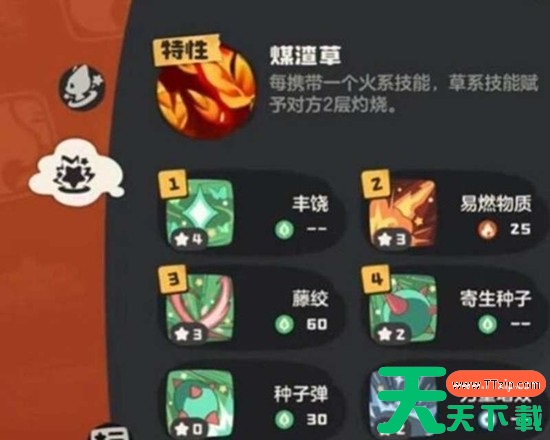 在技能选择上,一套常见的组合是易燃物质、充分燃烧、藤缚与毒袭。易燃物质作为多段攻击的草系技能,能高效触发煤渣草特性,单回合内可迅速叠加大量灼烧层数。