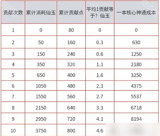 对照上图举个例子,比如一个玩家每天修葺3次,共花费150仙玉 累计获得240点贡献点,相当于获得1贡献点需要花费0.6仙玉,2000贡献点兑换一门神通,总价就是2000*0.6,约等于1200仙玉。