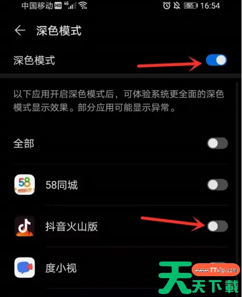 点击桌面【设置】,进入设置页面。 点击【显示和亮度】。 点击【深色模式】。 打开“深色模式”开关。 找到“抖音火山版”,打开右侧的开关即可。 设置完成。 @天天资源网TTzip 除特别注明外,本站所有文章均为 天天下载 原创,转载请注明出处来自 https://www.ttzip.com/247755.html
