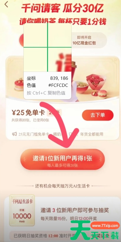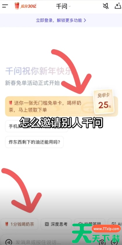 1、进入千问软件主页面,点击页面上的免单卡25的标题或者1分喝奶茶。