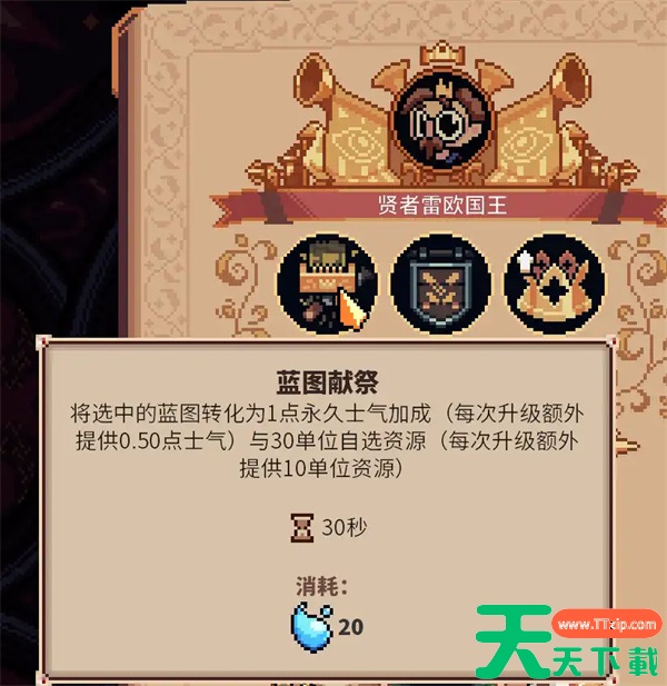 国王推荐贤者雷欧国王,在绿区的第二个位置就能买到,解锁相对也比较快。有三个技能第一个是蓝图献祭,可以将多余的蓝图直接转化成永久的士气和自选资源,两个对于我们都有用,尤其是永久的士气加成,骑兵要的就是冲锋秒怪士气非常重要。
