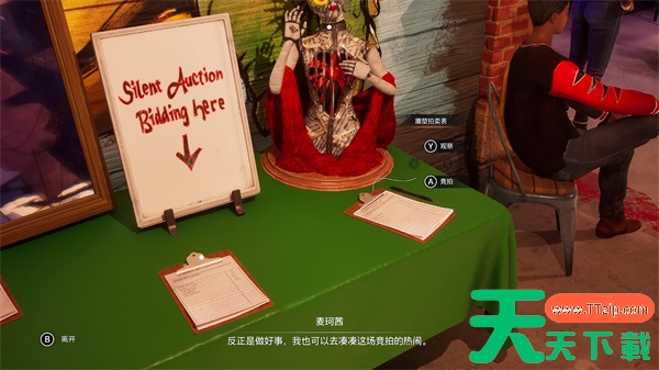 ②离开鳄龟酒吧前,查看无声拍卖台上的雕塑拍卖表,