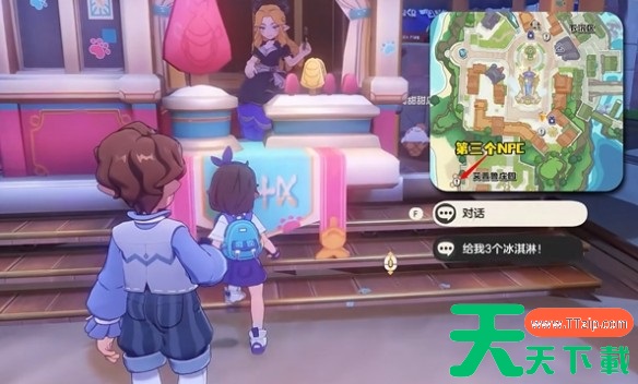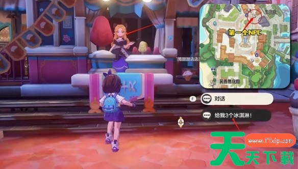 找到脆筒甜甜店的NPC并对话,领取3个冰激凌;