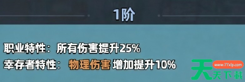其职业特性提供全类型伤害25%加成,幸存者特性额外提升物理伤害10%,二者叠加后,初始阶段物理输出能力已显著超越多数同阶角色。