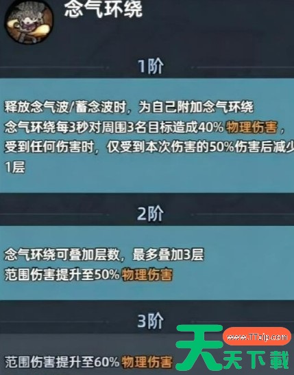 一星被动“念气环绕”提供战术容错:每次释放技能后,每3秒对周围敌人造成一次范围伤害,并为自身生成一个持续3秒、减伤50%的护盾。