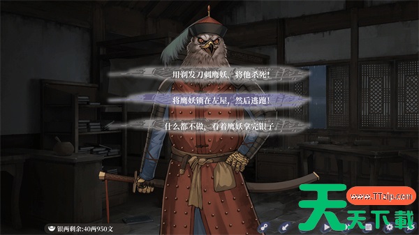 第四次财物分配时,选择"将鹰妖锁在左屋,然后逃跑!",