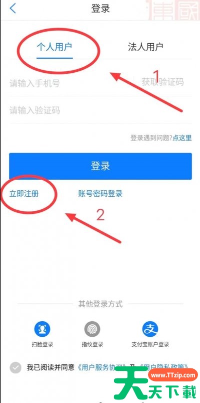 ①进入“爱山东”APP主界面,点开“我的”,点击右上角头像后,选择个人用户,点击“立即注册”按钮,输入常用手机号码,获取短信验证码,点击登录。
