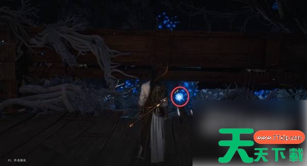 要清理水车上的藤蔓,需要射三朵花,两朵很容易发现,第三朵在下面,需要先操作转轮后才能通过木杆下的缝隙射到。