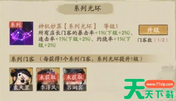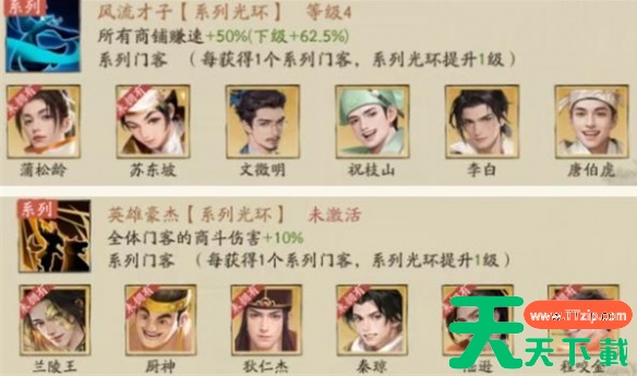 3、系列光环:集齐同一系列所有门客,可激活对应系列光环,大幅提升赚速;每激活或提升一级光环,都会获得对应的赚速加成,是后期赚速飞跃的关键。