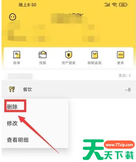 打开鲨鱼记账后,点击“记账”。 进入记账,选择要删除的记录。 进入下拉,点击“删除”。 @天天资源网TTzip 除特别注明外,本站所有文章均为 天天下载 原创,转载请注明出处来自 https://www.ttzip.com/248054.html