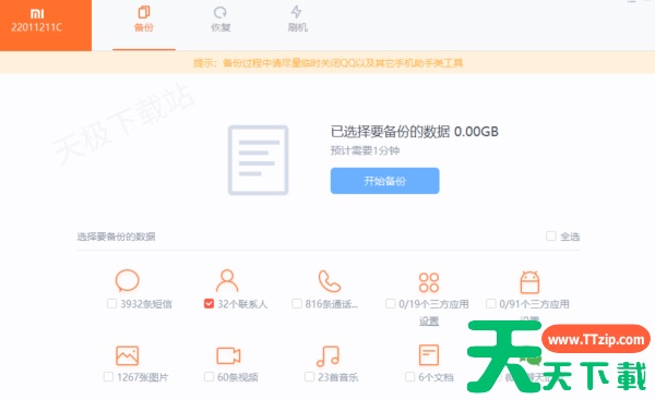 小米助手是一款由小米官方推出的专业实用、功能强大的PC端设备管理与服务工具。小米助手软件提供有数据备份与恢复、系统升级与刷机、文件传输与管理等实用功能,是小米手机用户进行数据备份和系统管理的首选工具。 小米助手怎么备份数据?小米助手备份数据的方法1、在电脑上打开小米手机助手软件,将小米手机用USB数据线与电脑连接,点击“连接设备”。 2、根据页面提示开启USB调试,点击小米手机设置-我的设备-全部参数,然后连续点击“MIUI版本”直至出现“您已处在开发者模式”。 3、回到设置界面,点击更多设置-开发者选项-USB调试,在手机端点击“确定”,然后继续确定“允许USB调试”。 4、连接完成后,点击上方“备份”-“新建备份”,在电脑和手机同意请求,对手机进行扫描。 5、最后点击需要进行备份的数据,开始备份即可。 @天天下载TTzip 除特别注明外,本站所有文章均为 天天下载 原创,转载请注明出处来自 https://www.ttzip.com/248072.html