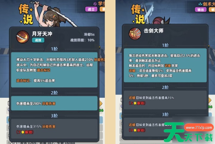 举例:学生妹的技能月牙天冲,可以给自己和队友附加追击标记,增加追击率,打出连环输出;而击剑大师在触发追击时,将给敌人挂上“迟缓”效果,降低敌人的输出,提高追击的伤害。