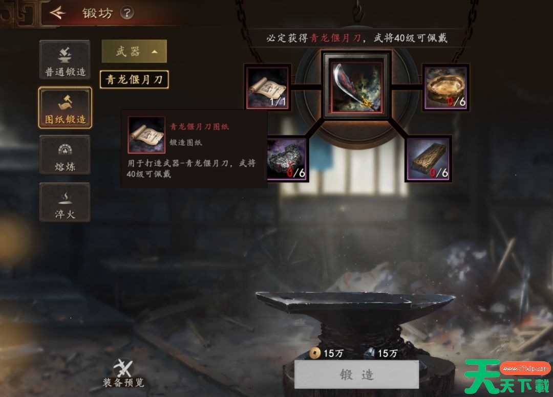 1、图纸锻造绝品(红)装备都是历史中有名有姓的神兵利器,如青龙偃月刀、青釭剑等,该类装备可以通过高级锻造小概率随机获得,如果拥有对应的图纸便能定向锻造,图纸和锻造材料都可以通过击败地图上随机出没的贼寇获取。
