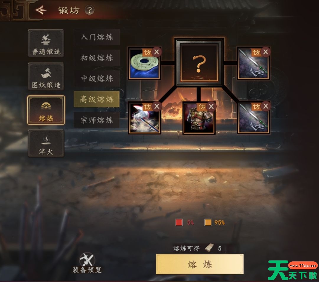 可将多个同品质的装备熔炼成新装备,有小概率进阶为更高品质装备。赛季末可以批量高级锻造,将不满意的名品(橙)装备熔炼,搏一搏绝品(红)装备