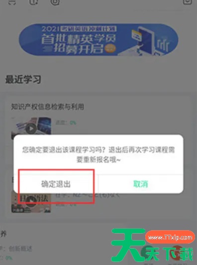 打开知到手机版,点击下方的“学习”选项,选择要删除的课程,向左滑动。 点击“放弃学习”选项。 ,操作完成后具体情况如下图所示。 点击“确认退出”即可,操作完成后具体情况如下图所示。 @天天资源网TTzip 除特别注明外,本站所有文章均为 天天下载 原创,转载请注明出处来自 https://www.ttzip.com/248276.html