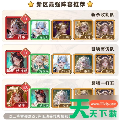 第二套侧重极限输出节奏:吕布、典韦、祝融、吕玲绮、张角。此阵容采用双核物理输出结构,吕布负责定点斩杀,典韦承担持续站场与反伤牵制;祝融与吕玲绮分别提供灼烧叠层与暴击穿透类额外伤害,配合张角的雷系控制与法术增益,可在3回合内完成对敌方核心单位的集火清场。该体系对装备词条与技能等级有一定要求,但五名角色均可通过主线副本、限时召唤及日常任务稳定获取,无需依赖高概率稀有卡池。