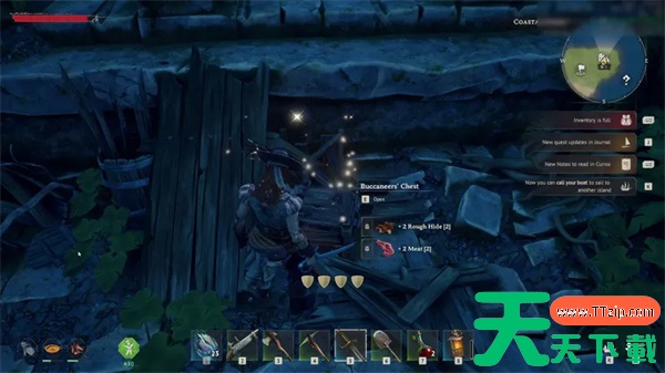 继续绕过左转角,去搜刮第二个海盗宝箱。里面有一把断裂的火枪和马塞尔·布歇的日记。这些都是任务物品。